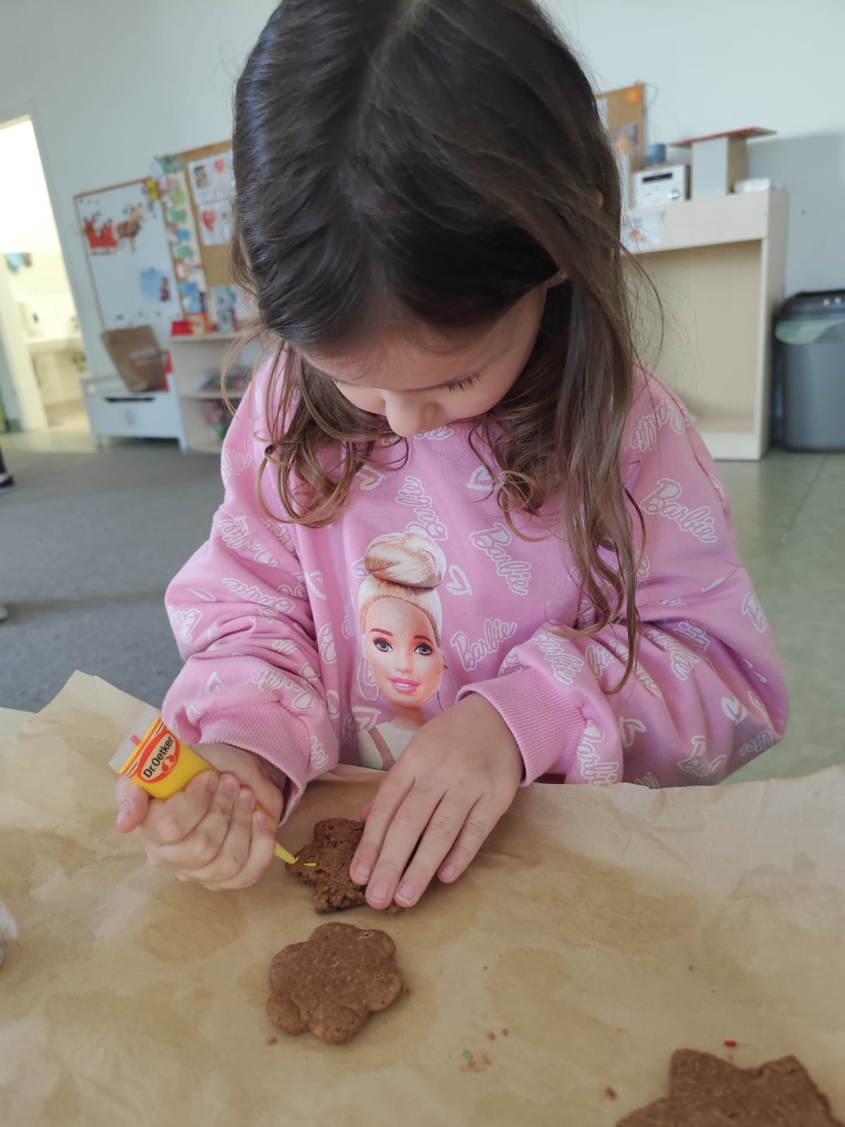 Dzieci w przedszkolu dekorujące świąteczne pierniczki podczas zajęć kulinarno-plastycznych.