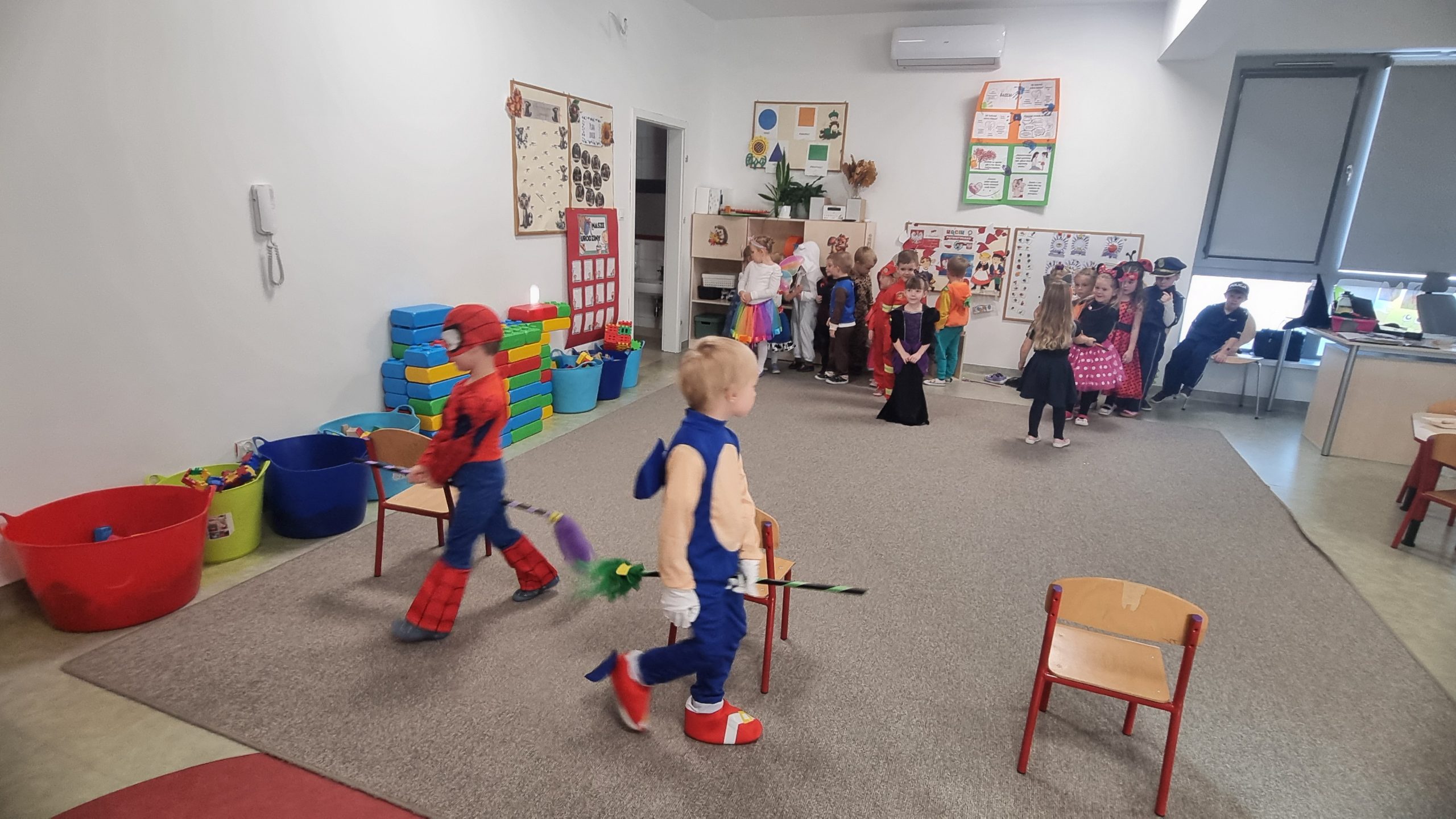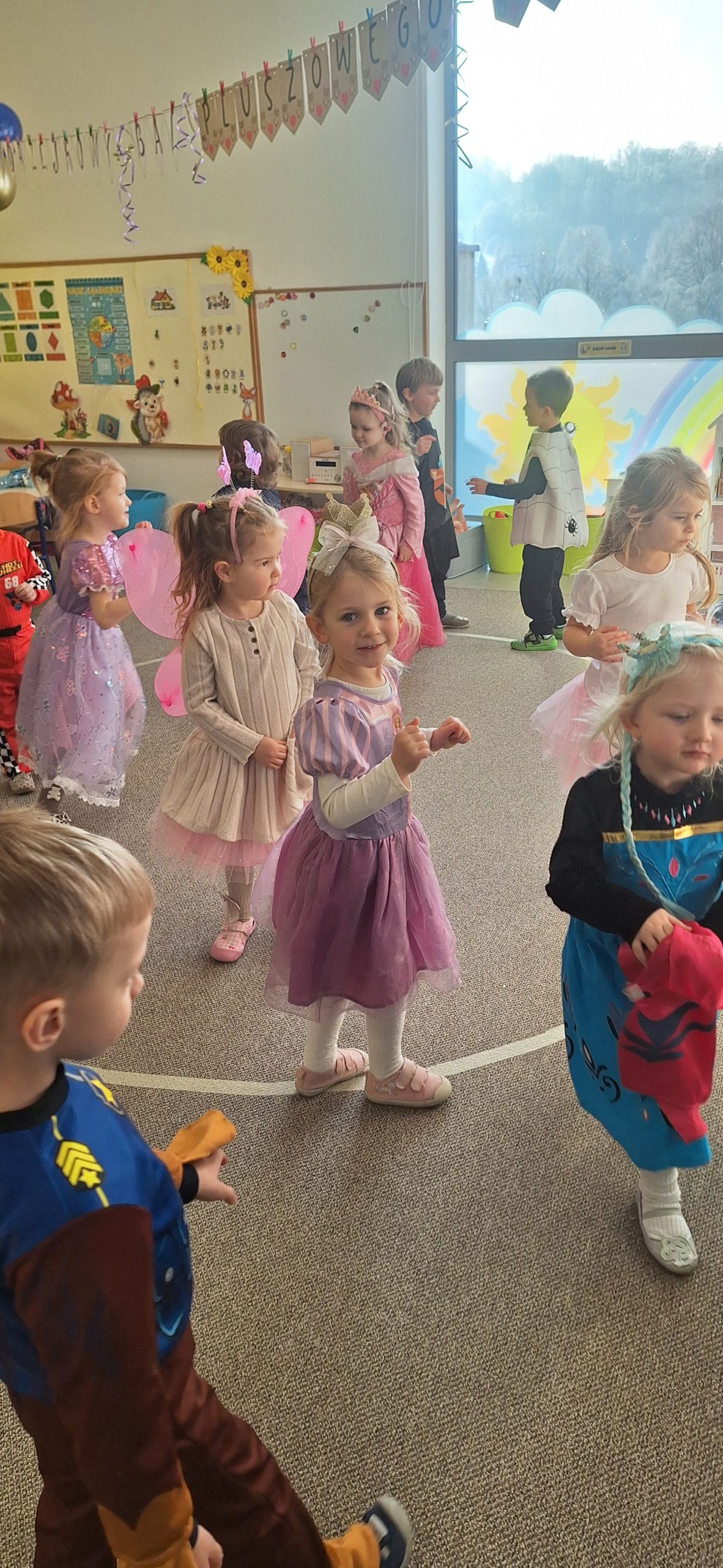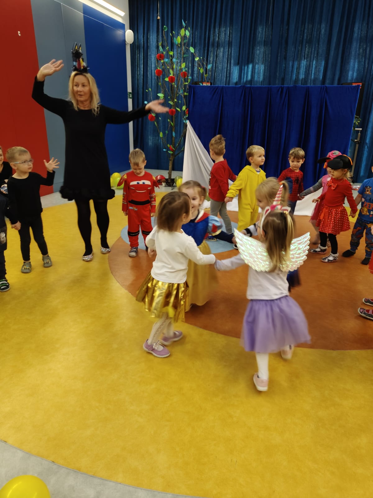 Dzieci przebrane za wróżki i czarodziejów podczas zabawy andrzejkowej w przedszkolu.