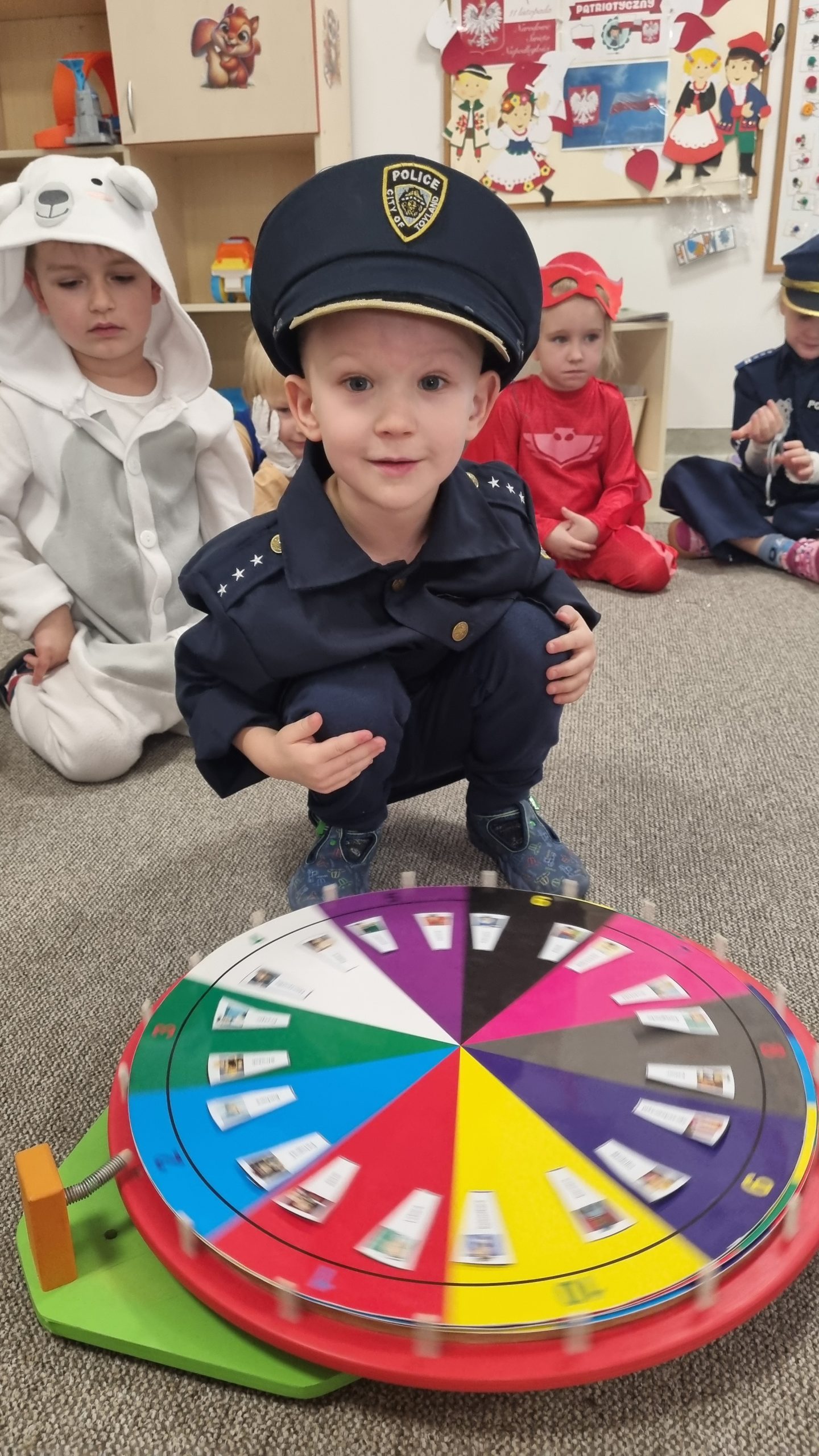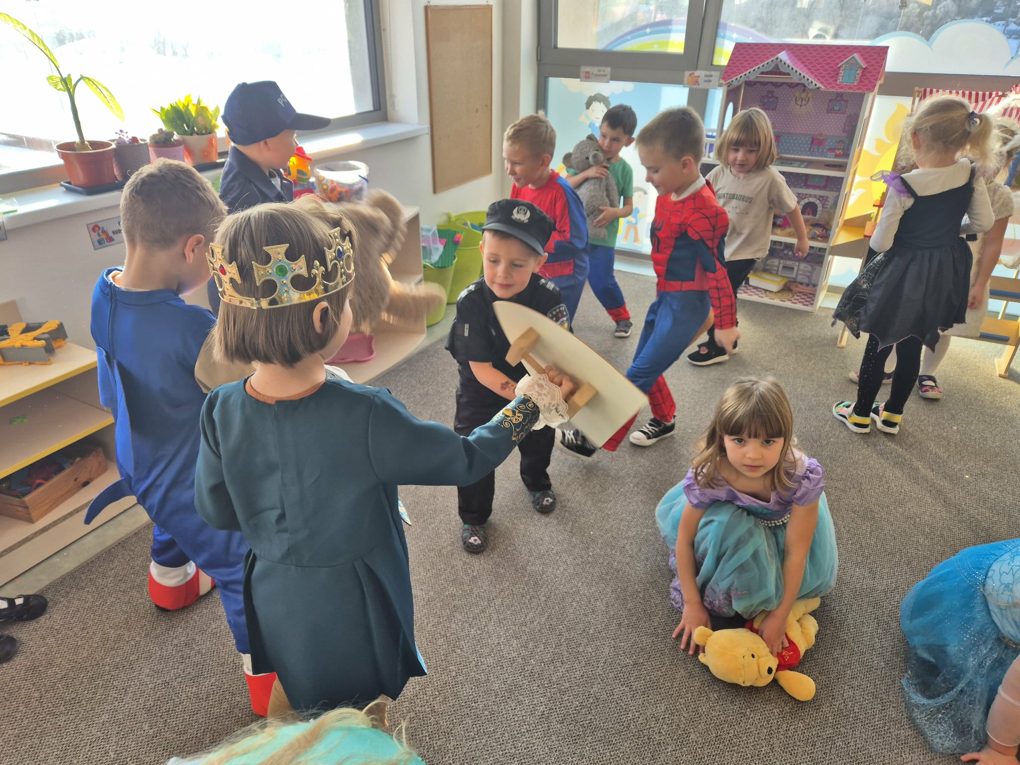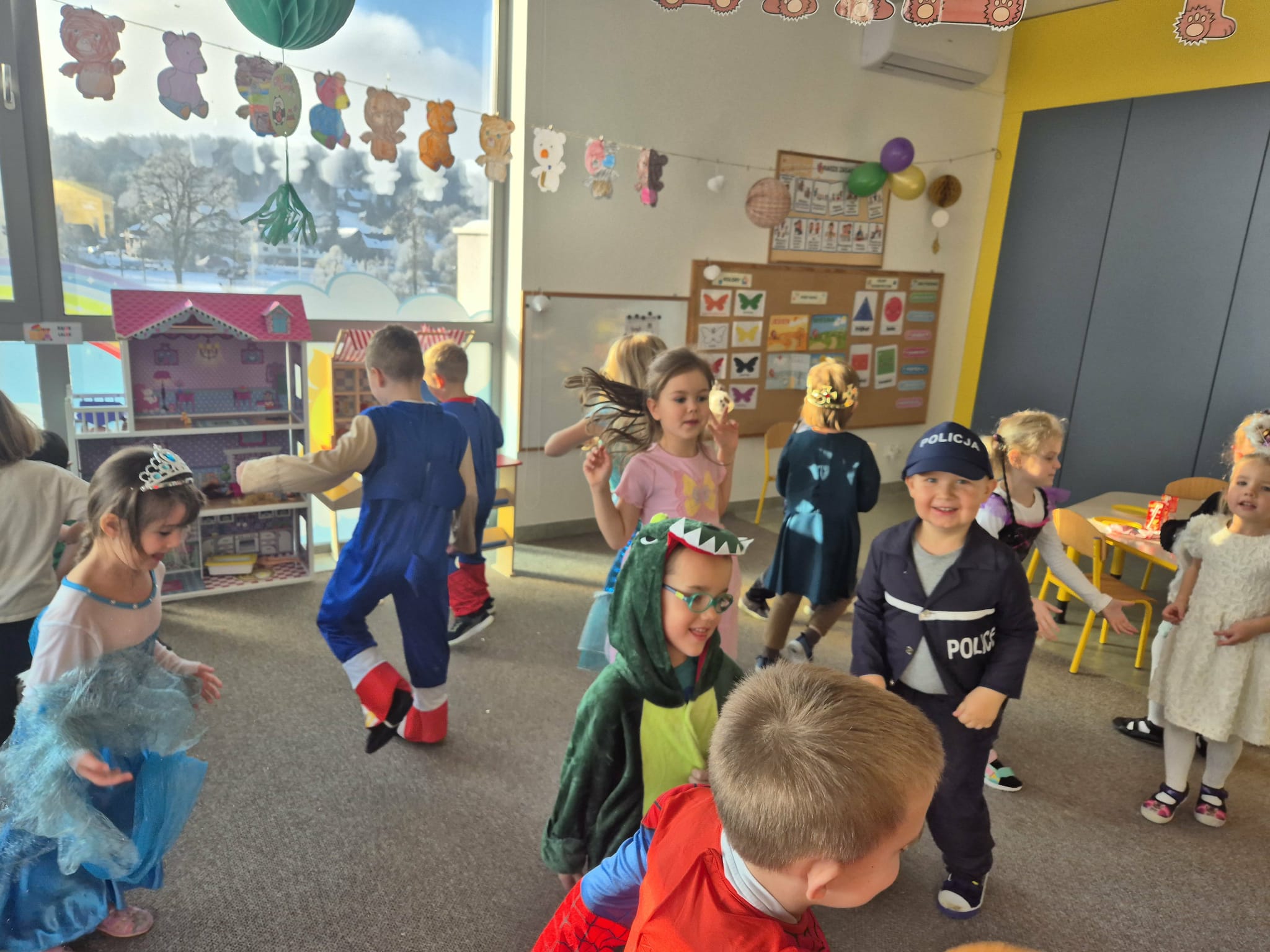 Dzieci przebrane za wróżki i czarodziejów podczas zabawy andrzejkowej w przedszkolu.