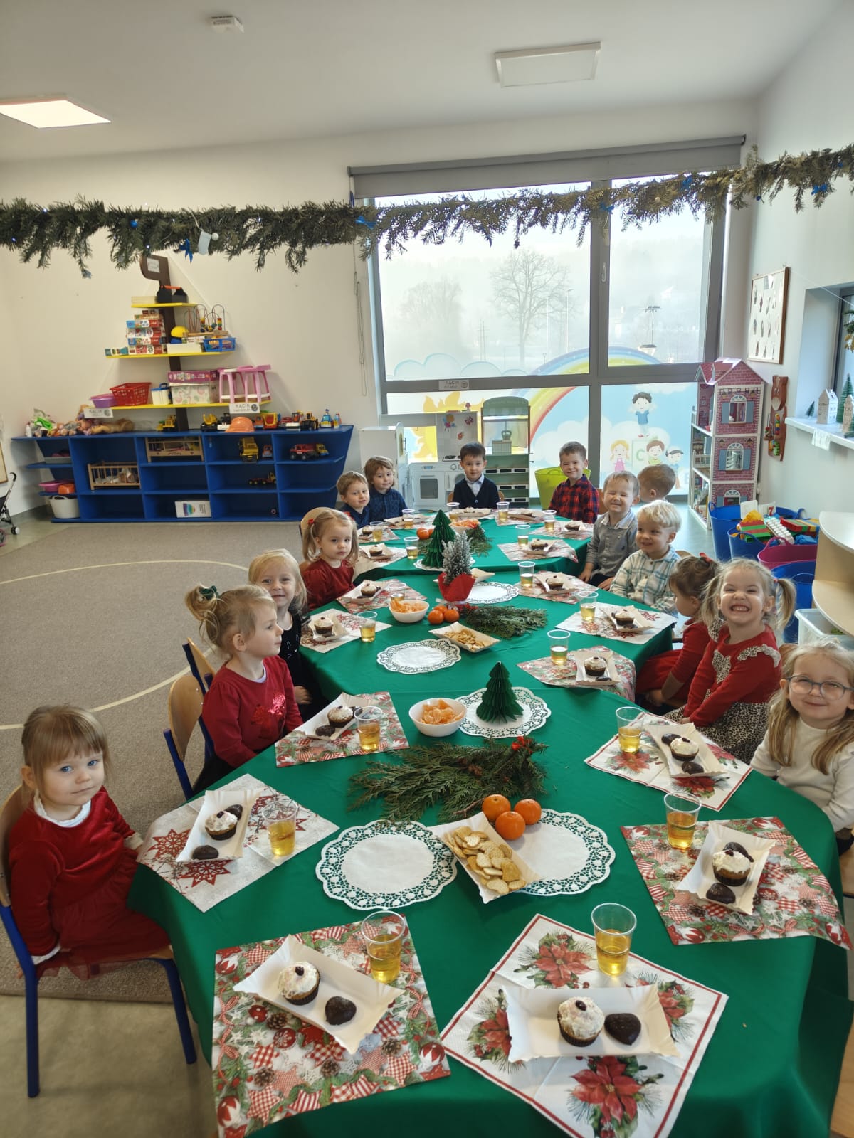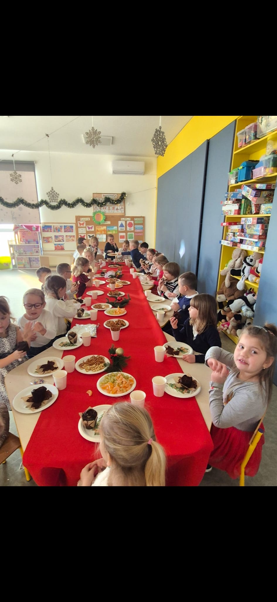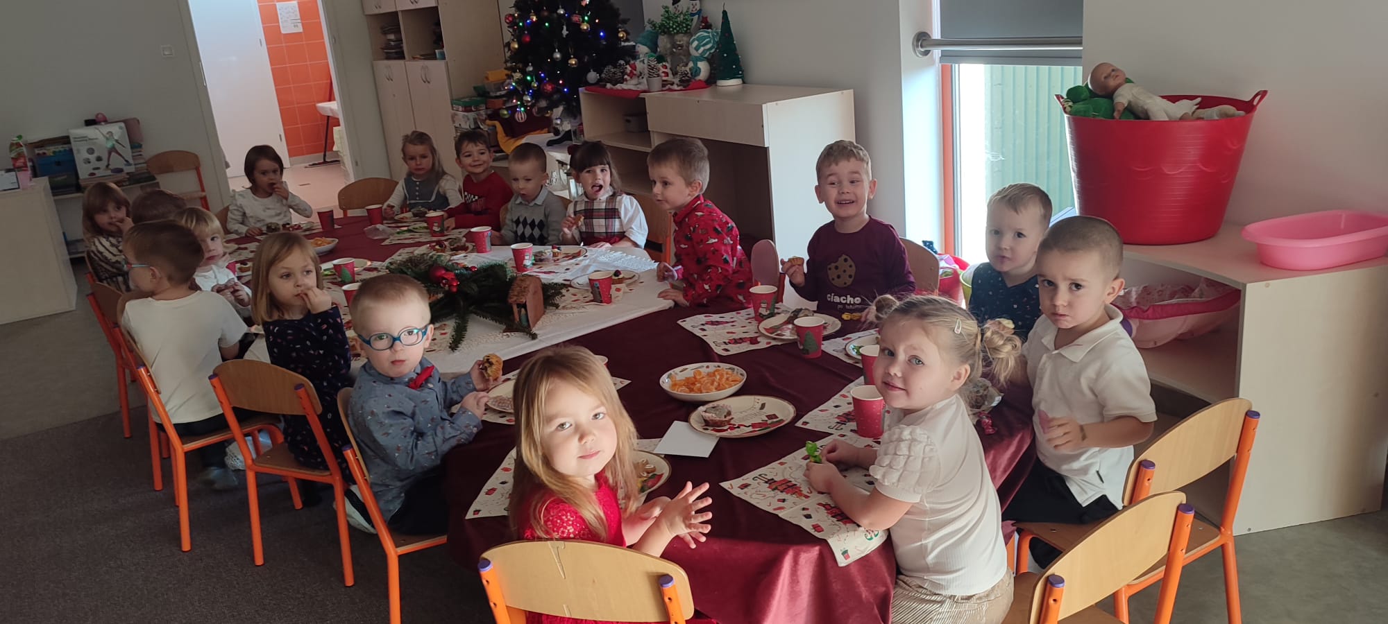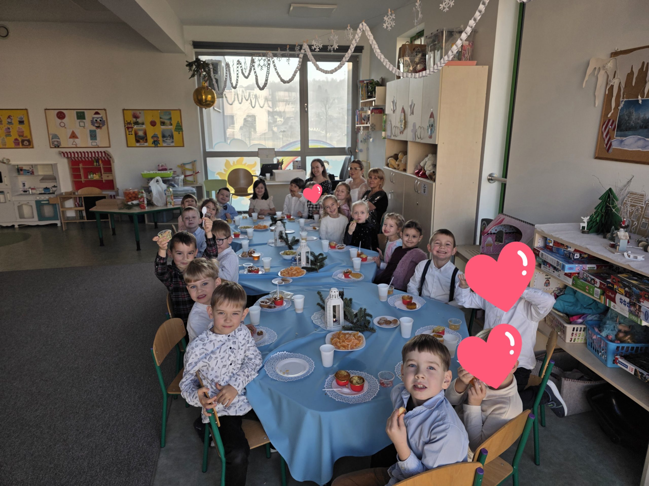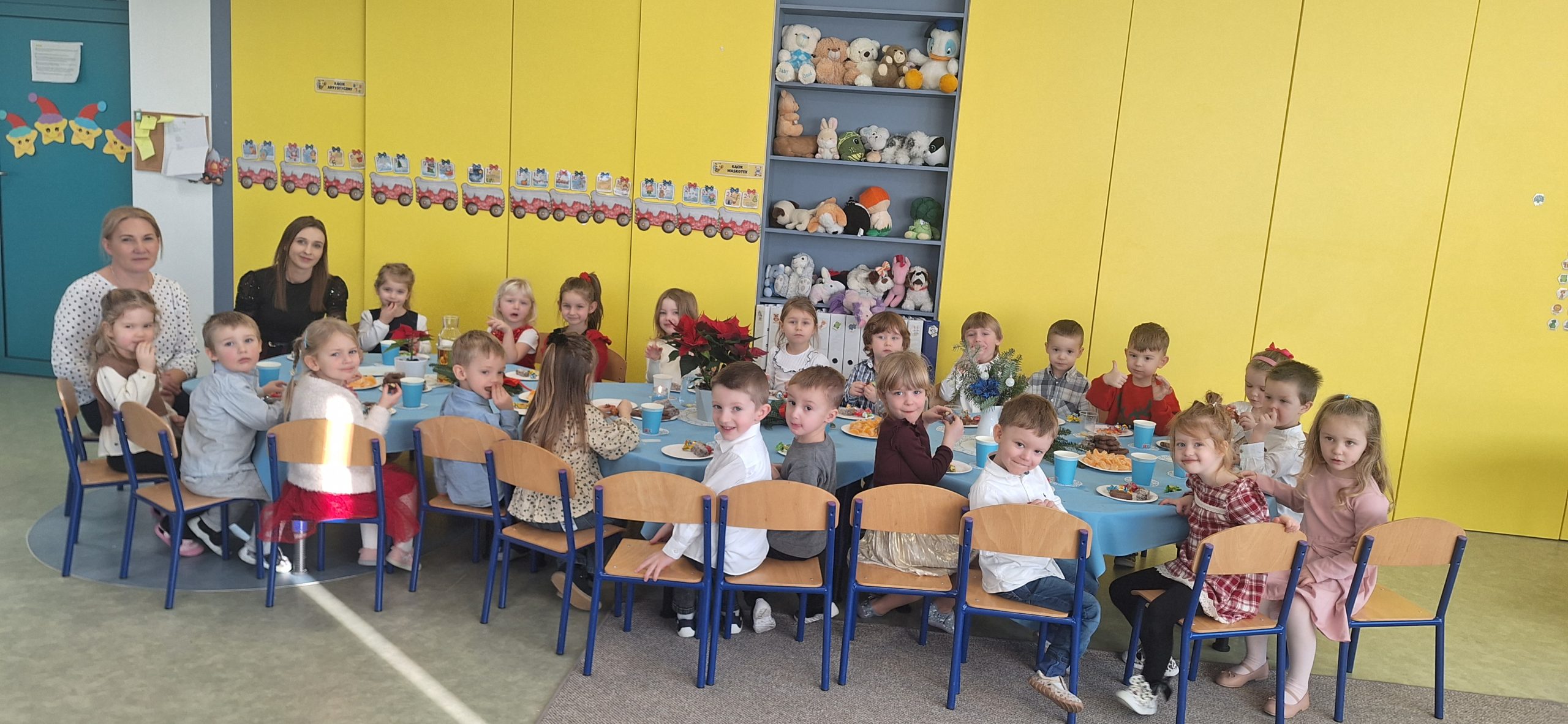 W naszym przedszkolu zapanowała wyjątkowa, świąteczna atmosfera. We wszystkich grupach odbyły się wigilie przedszkolne, które choć organizowane w poszczególnych salach, miału wspólny, uroczysty charakter. Dzieci przy świątecznie udekorowanych stołach dzieliły się opłatkiem, składały sobie życzenia oraz wspólnie kolędowały.