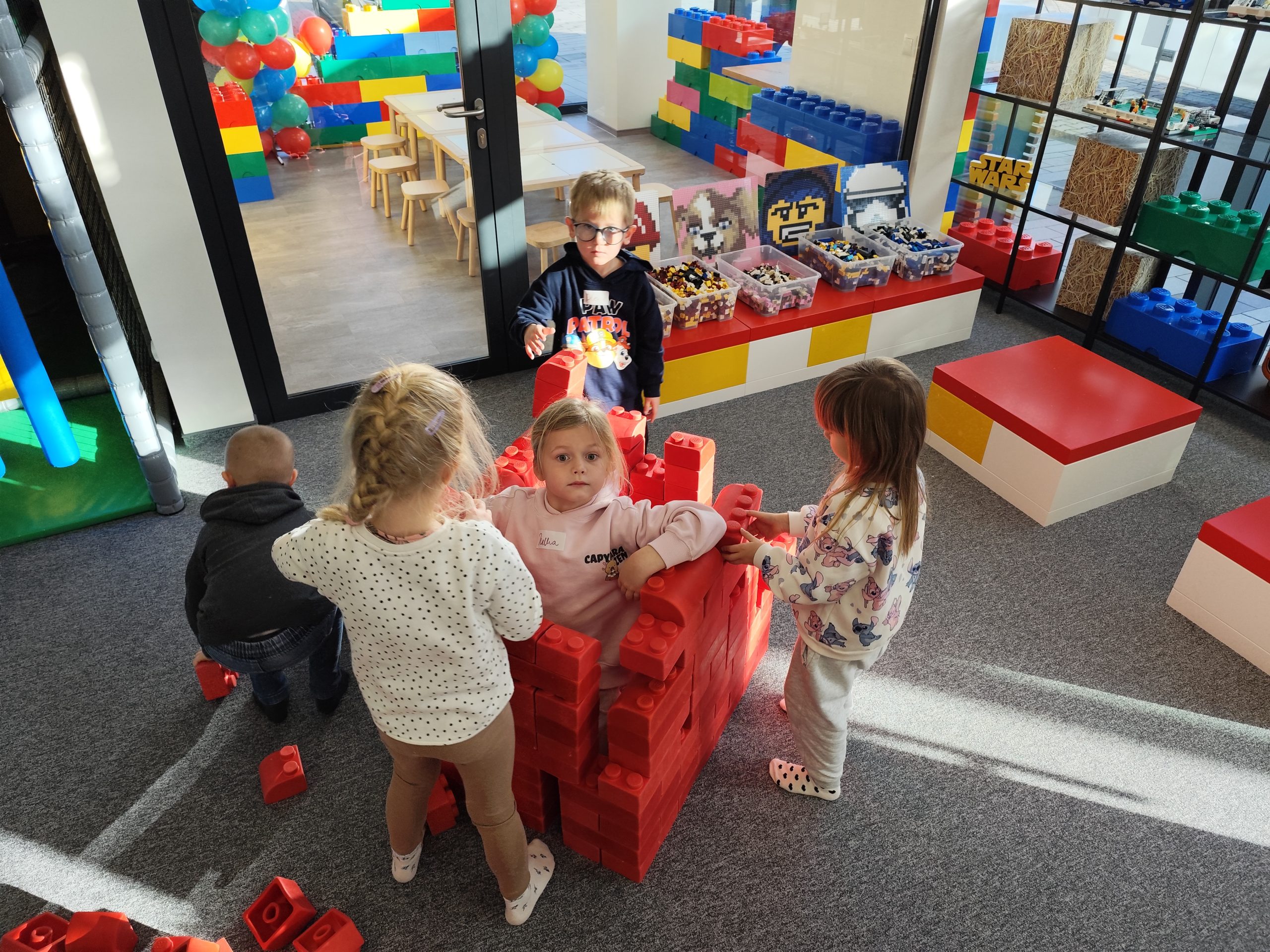 Dzieci bawiące się klockami konstrukcyjnymi w kolorowej sali zabaw, pełnej elementów LEGO i kreatywnych konstrukcji.